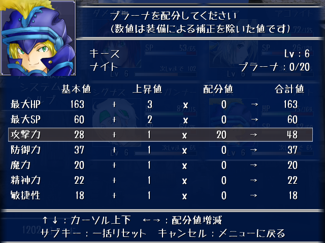 経験値累積によるレベルアップはもちろんのこと、スキルの取得とスキルレベルの上昇、プラーナと呼ばれる数値を配分することで得られるステータス補正、キャラクタごとに設定できるセリフ、等。